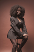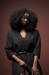 La mannequin porte une perruque premium Rocky Afro Wave, en HD lace frontale 6x6, de 18 pouces avec une densité de 250%.